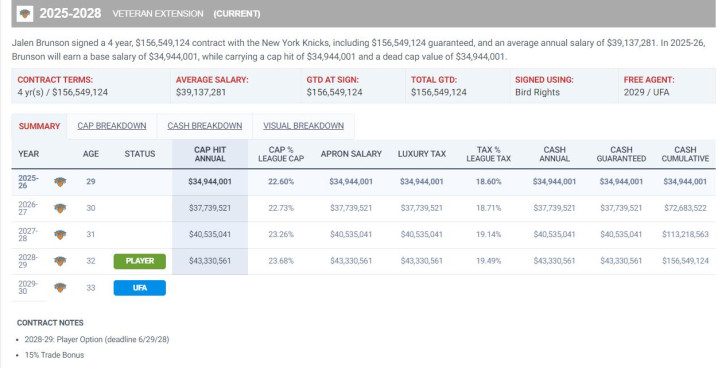 为什么说布伦森摄取了1.13亿的降薪呢?因为布伦森要是是在2025年夏续约他就能签下五年2.69亿的超等顶薪,他在2024年夏提前续约不仅顶薪要少一年,薪资总数也要少1.13亿。
