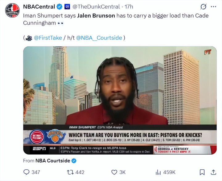 前NBA球员伊曼-香波特评价布伦森与坎宁安两个东部顶级控卫,他走漏布伦森地方环境比坎宁安难好多,布伦森要承担的压力远远逾越坎宁安。