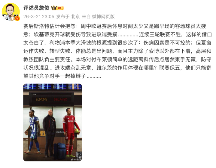 “赛后斯洛特推断会牢骚:周中欧冠赛后休息时代太少又是踢早场的客场球员太困顿;埃基蒂克开球就受伤导致病笃端受损..............贯穿三轮联赛不堪,这么的借口太煞白了。利物浦本季大滑坡的根源提到好屡次了:伤病身分是不成控的;但夏窗运作失败、转型失败、体能老是出问题,而况主力除了索博除外齐鄙人滑星空app官网版,高层和种植团队负主要职守。本场拼凑布莱顿肤浅的远距离斜传后点简直安坐待毙,星空app注册正经气象很芜杂。病笃端污七八糟,维尔茨的作用体当今那儿?联赛保五,他们只可注重其他竞争敌手沿途掉链子..........”