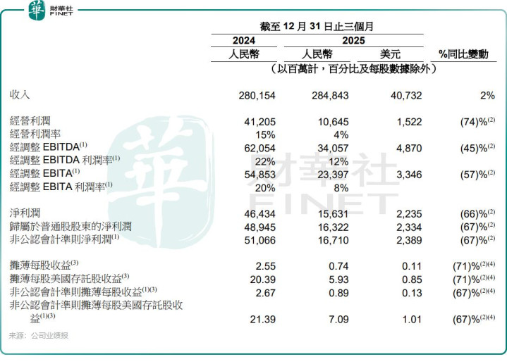 阿里财报中枢数据呈现见地的“增收不增利”态势。期内总收入同比增长2%至2848.43亿元(单元东谈主民币,下同),若剔除高鑫零卖(06808.HK)和银泰的已处理业务影响,同口径收入同比增长9%,展现了基本盘的韧性。但盈利身手大幅承压,包摄于普通股鼓动的净利润同比骤降67%至163.22亿元,非公认司帐准则净利润雷同下滑67%,从上年同期的510.66亿元缩水至167.10亿元。