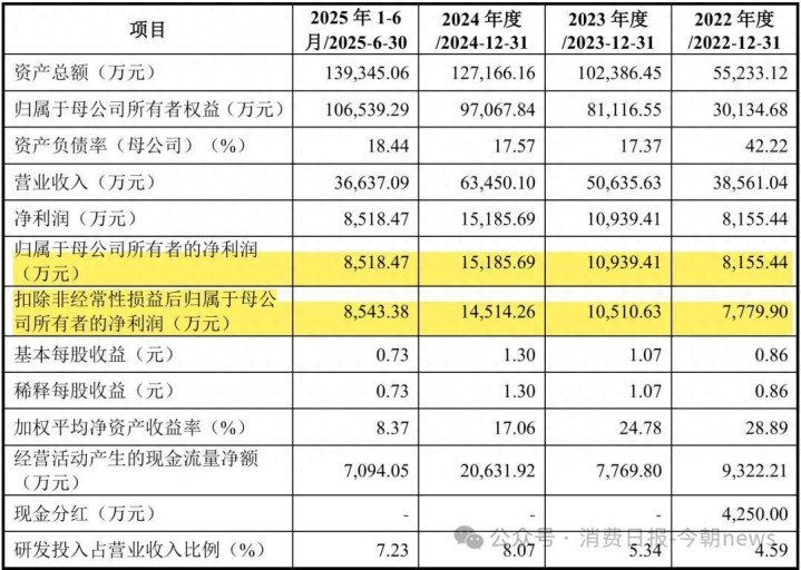 最新招股书透露,臻宝科技2022年、2023年、2024年以及2025年上半年,营收远离为3.86亿元、5.06亿元、6.35亿元、3.66亿元;净利远离为0.82亿元、1.09亿元、1.52亿元、0.85亿元;扣非后净利远离为0.78亿元、1.05亿元、1.45亿元、0.85亿元。