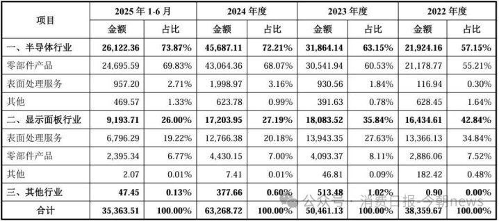 2022年至2024年以及2025年上半年,臻宝科技在半导体行业的收入远离为2.19亿元、3.19亿元、4.57亿元、2.61亿元,增速较快。营收占比也水长船高,从57.15%攀升至73.87%。