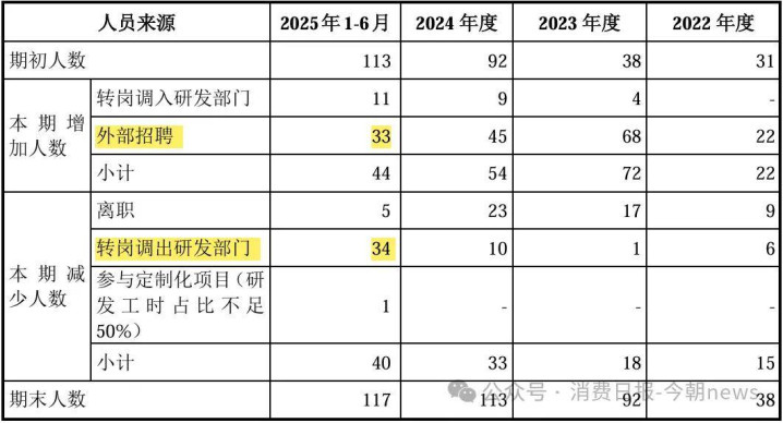2023年、2024年以及2025年上半年,公司出现里面转岗调入研发部门的景观,并从个位数上升至两位数。与此同期,每年还要从外部招聘几十个研发东谈主员,2023年达到68东谈主,2025年上半年便招聘33东谈主。