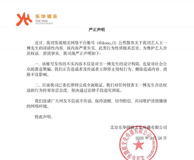 对此,王一博所属经纪公司乐华文娱,今早发声明辟谣,直指网罗账号「ikooo_O」公然划分责难骨子,步履极其恶劣,严正条件谴责者立即住手侵权并删除干系骨子。 公司强调,王一博是遭到他东说念主毁坏,现在已托福讼师完周至面取证,将透过法律阶梯重办抹黑者; 同期,公经理人命令外界保握涌现,停止投契取巧,共同爱戴健康的网罗酬酢环境。
