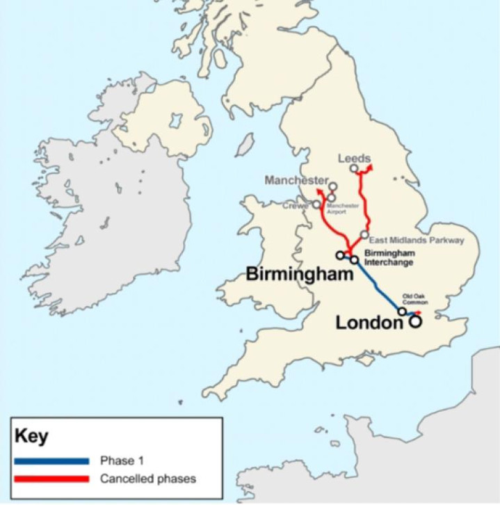 英国HS2高铁流露图 · 标注已建与取消路段的英国高铁流露图