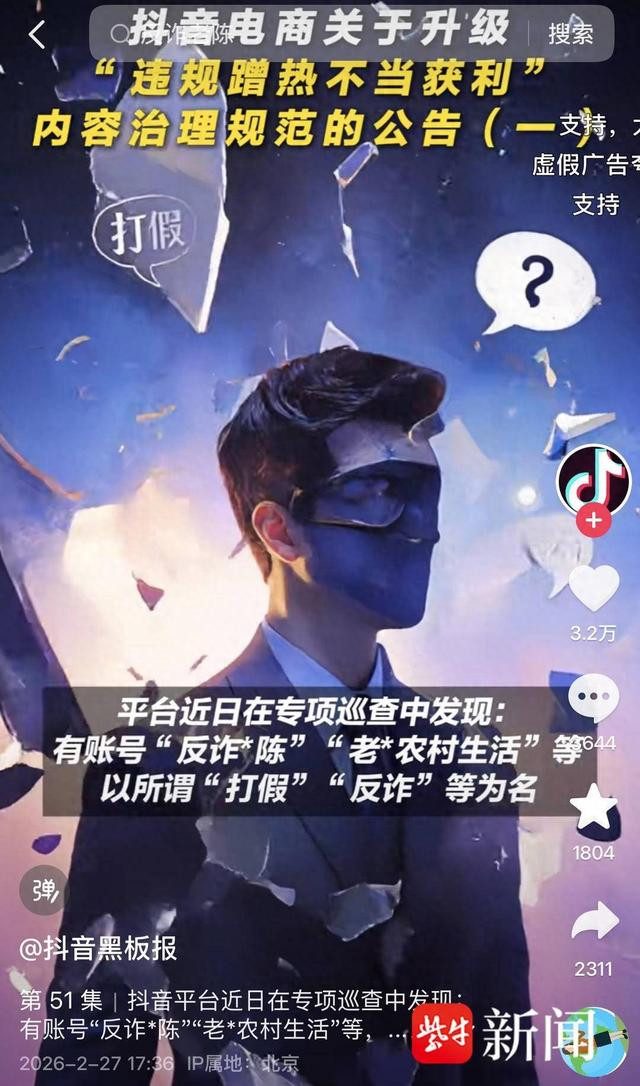 2月27日,抖音黑板报发布本体,称抖音平台近日在专项查看中发现:有账号“反诈*陈”“老*农村糊口”等,以所谓“打假”“反诈”等为名,在缺少科学分析、密致研判以至事实依据的前提下,以“喊话”等神色,反复发布坏心挫折、无端质疑。以至发布侮辱他东谈主东谈主格或企业声誉的关联信息,试图通过标签化挫折,刻意挑动网友厚谊、营造对立,并借此激发各方情切,收割争议流量,搅扰交易表率、龙套平正竞争。