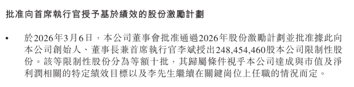 值得一提的是,蔚来方面还在财报中泄露,公司董事会于3月6日批准通过2026年股份引发贪图,并批准据此向李斌授出约2.48亿股公司箝制性股份。