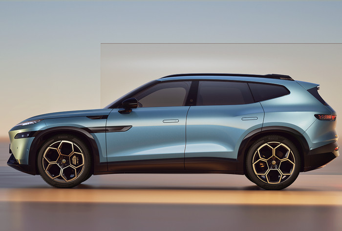 与众08定位中大型纯电SUV,车身尺寸为5000/1954/1688mm,轴距3030mm,举座剿袭短前悬、长后悬的德系比例,搭配1.5米超长前机舱盖,同期融入东方对称好意思学,以一条金色中央脊线相接车头至车尾,构建出矜重舒展的车身姿态。