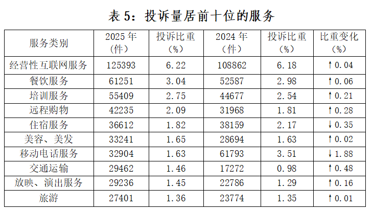 在具体服务投诉中,投诉量居前五位的分别为(如图5所示):经营性互联网服务、餐饮服务、培训服务、远程购物、住宿服务。与2024年相比(如表5所示),交通运输、远程购物、培训服务投诉上升,移动电话服务、住宿服务投诉下降。