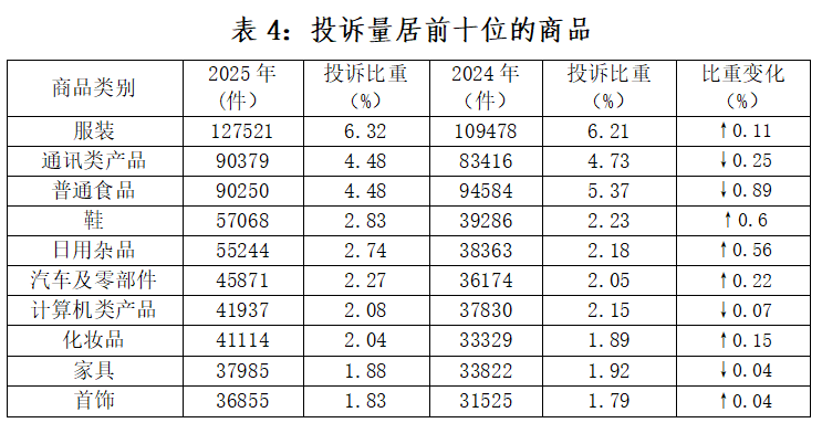 在具体商品投诉中,投诉量居前五位的分别为(如图4所示):服装、通讯类产品、普通食品、鞋、日用杂品。与2024年相比(如表4所示),鞋、日用杂品、汽车及零部件投诉上升,普通食品投诉小幅下降。