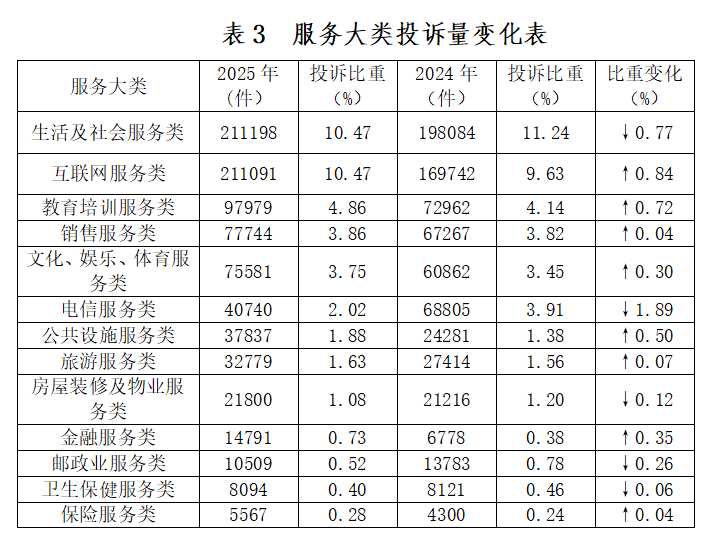 根据2025年服务大类投诉数据(如图3、表3所示),生活及社会服务类,互联网服务类,教育培训服务类,销售服务类,文化、娱乐、体育服务类居前五位。与2024年相比,互联网服务类、教育培训服务类、公共设施服务类投诉量比重上升,电信服务类、生活及社会服务类投诉量比重下降。