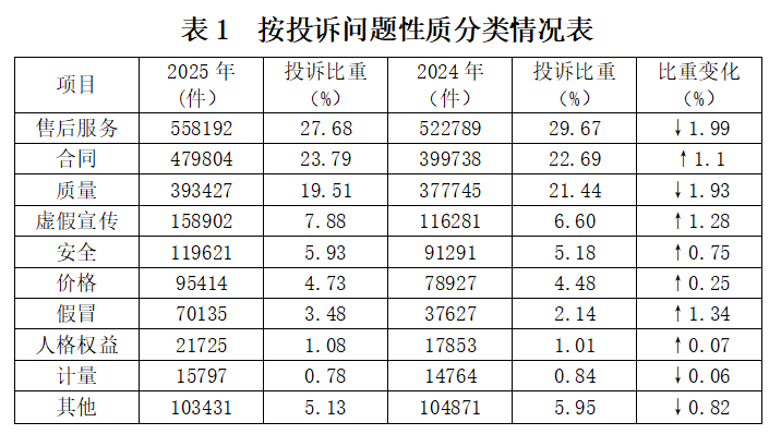 与2024年相比(如表1所示),假冒、虚假宣传、合同问题投诉比重上升,售后服务、质量、其他问题投诉比重下降。