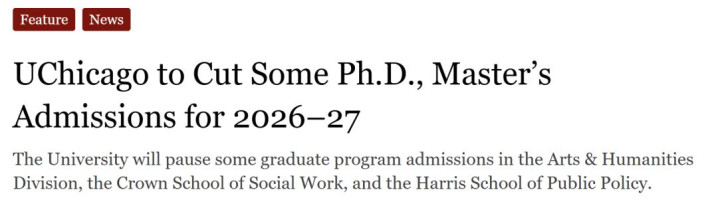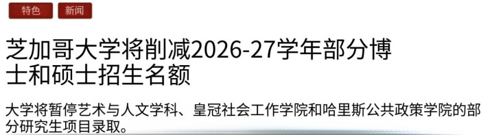 芝加哥大学先是晓喻重组吞并文科院系,随后胜仗官宣,2026-2027学年将减少一半系所的博士招生规模,以至完全罢手古典学、比拟体裁、中东商讨等文科博士项方针招生;社会科学学院也紧随后来,暂停了东说念主类学、政事经济学等文科博士形态。