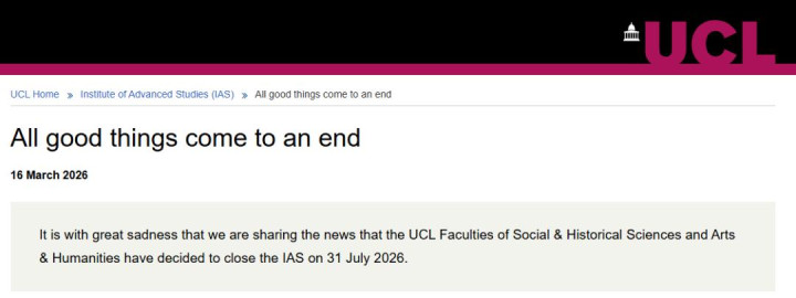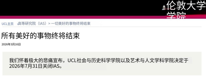 起初激勉原宥的,是伦敦大学学院(UCL)的官宣——本年7月31日,学校将认真关闭建立整整十年的高档商讨院(IAS),这个被好多学者称为“学术乌托邦”的机构,承载着东说念主文艺术和社会历史规模的前沿商讨,联结国教科文组织注册的奥威尔档案馆也设在这里,它的关停,被看作是文科遇冷的贫困信号。