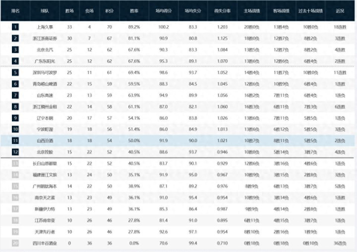 星空 CBA排行榜: 北京广东皆大捷位居前四, 青岛险胜辽宁挺进季后赛